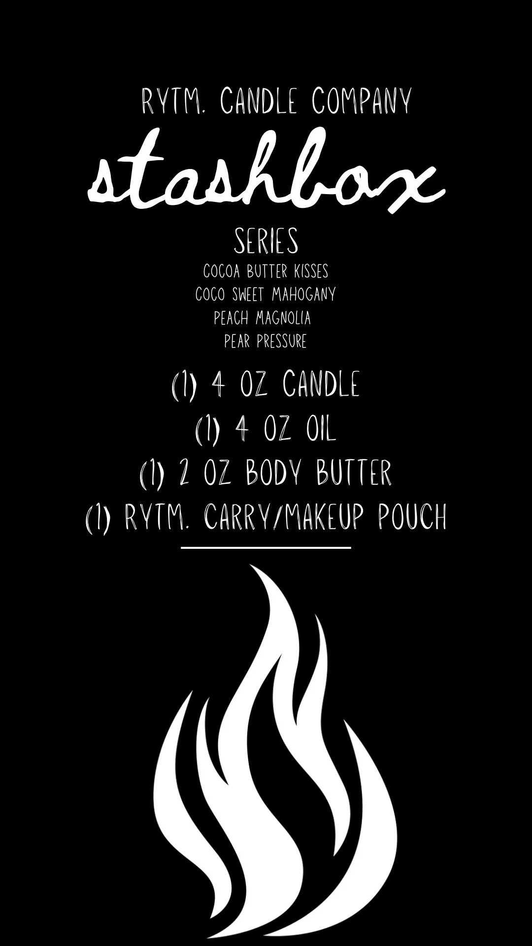 Each box comes with a 2 oz Body Butter, 4oz Body Oil, 4oz, Rytm. Candle & a Rytm. Zip Makeup/Pouch!